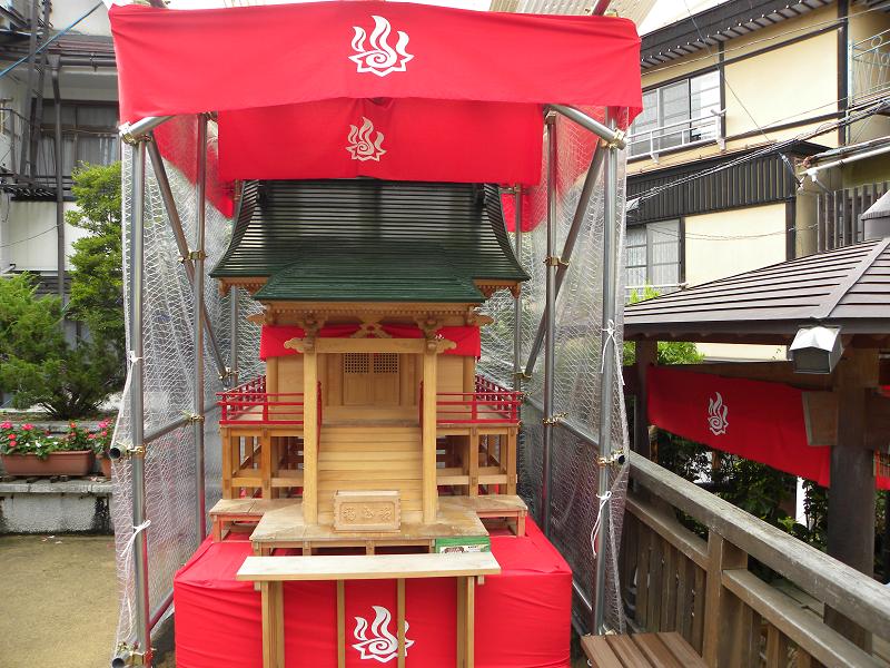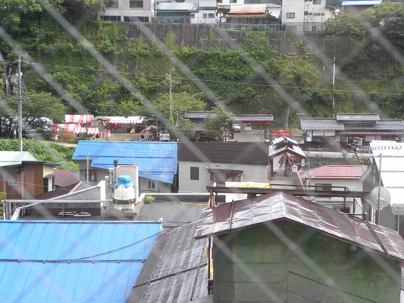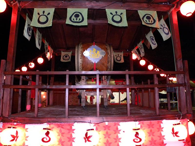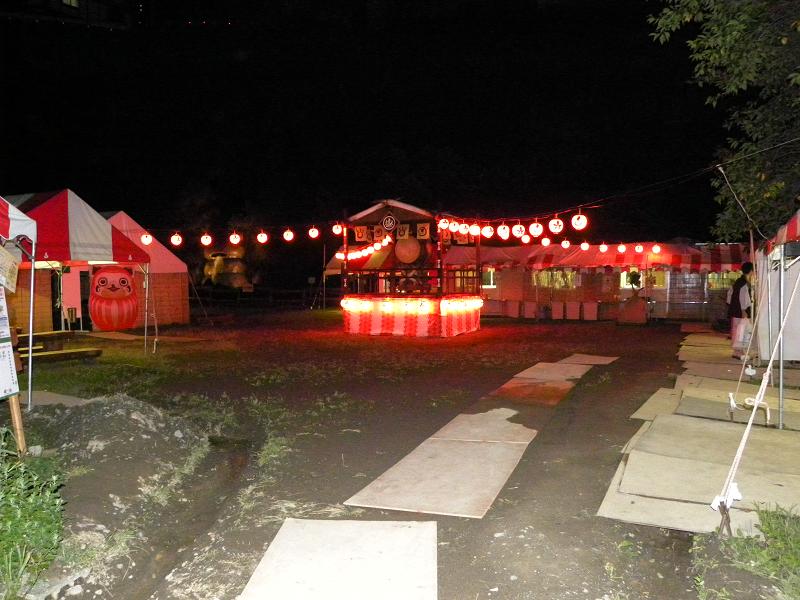 ちょっと解り難いですが、紅白のテントがあるところが集会所や屋台のテントです。櫓や提灯なんかも見えます。