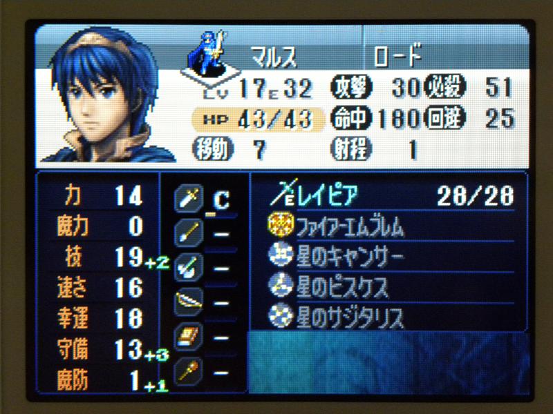 そんでもってマルス。今回、ロードを含め盗賊や踊り子などの転職不可能職種はレベル上限が30に設定されてるのでこんなに弱くても安心。