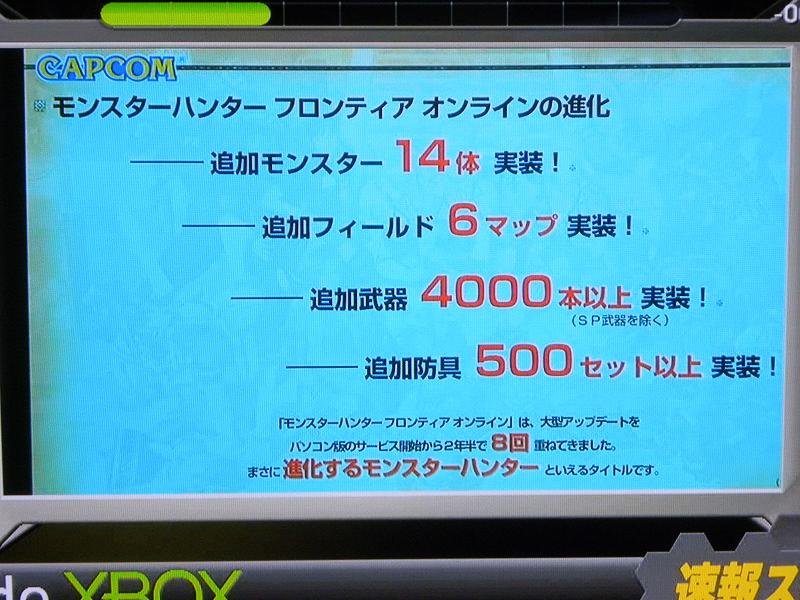 1月26日に開かれた「CAPCOM Title Premiere」においてMHF、ロストプラネット2などのは発表がありました。 MHFinXBOX360は2010年夏サービス開始。完全新サーバー設立とのことで、ゲームシステムは既に完成しているので、後は安定したサーバーの調整をしている段階だそうです。